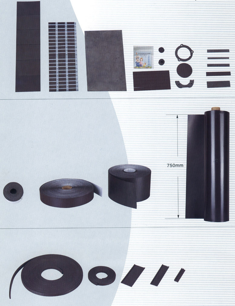 可作為磁性物體的吸附底版,柔軟安全,可捲曲,便於加工,可成卷供貨,最大寬度750mm,厚度0.3-1.5mm,表面可覆膜,印刷,可用作吸波材料,磁路遮罩.廣泛用於變壓器,辦公用品,展示板,玩具,文具,磁性飛鏢等方面;