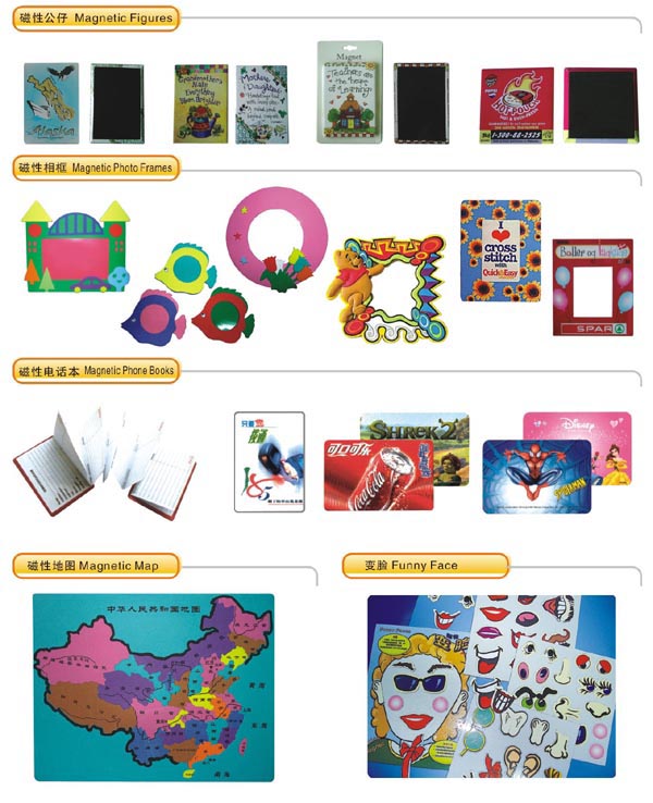 磁片上複銅版紙,或複白色PVC薄膜,印上精美圖案,可模切成各種形狀精美磁性冰箱貼,主要用於廣告宣傳,促銷贈品,兒童卡通玩具等;